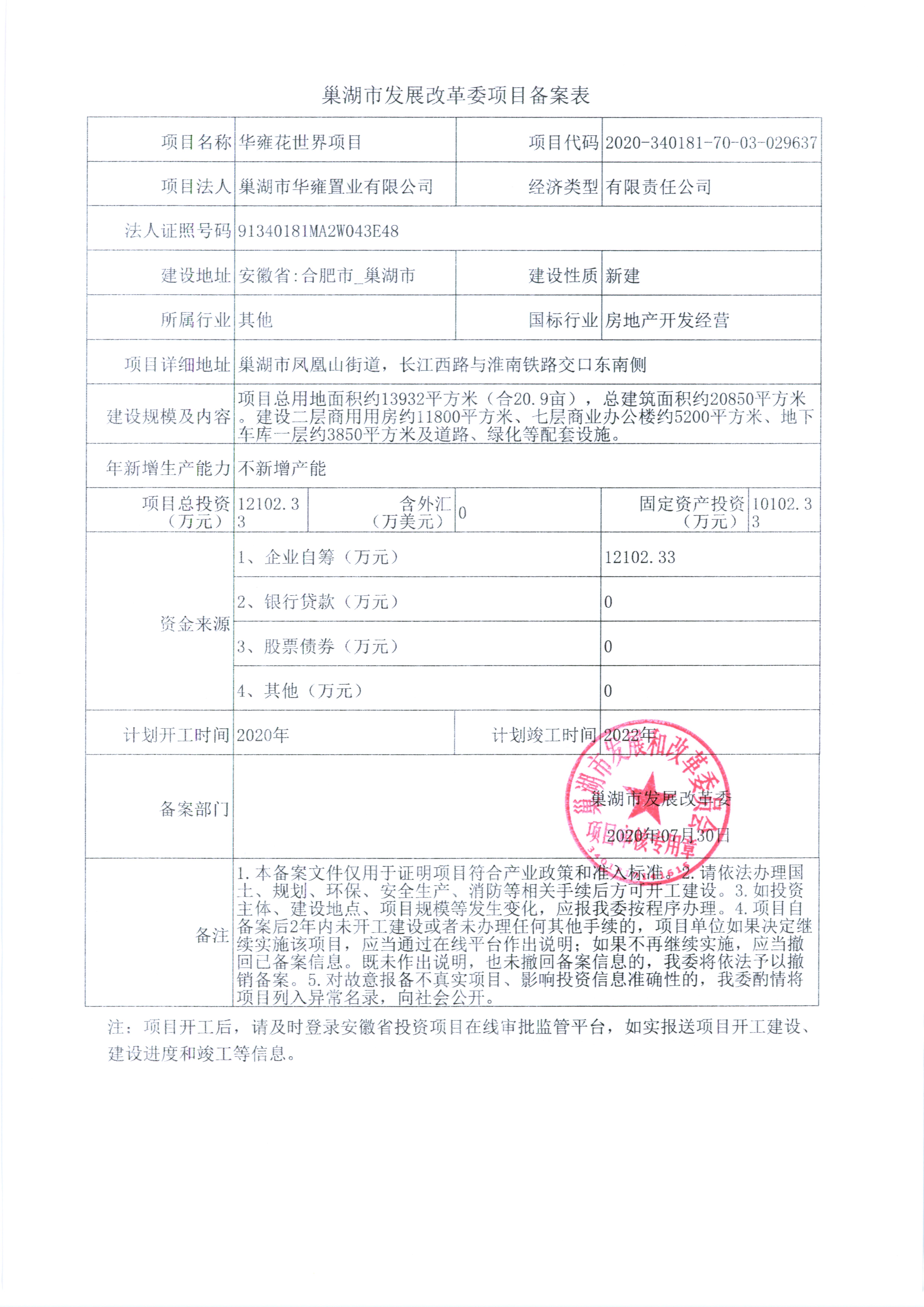 根据《水利部办公厅关于做好生产建设项目水土保持承诺制管理的通知》(办水保〔2020〕160号)的有关规定,现将实施的“华雍花鸟市场项目”水土保持方案报告表全文予以公示,接受社会监督,公众如有问题和意见,自公示之日起10个工作日内可通过信函、电话或其他方式向巢湖市华雍置业有限公司进行反映,针对反映的问题我单位将逐一进行处理与回应。